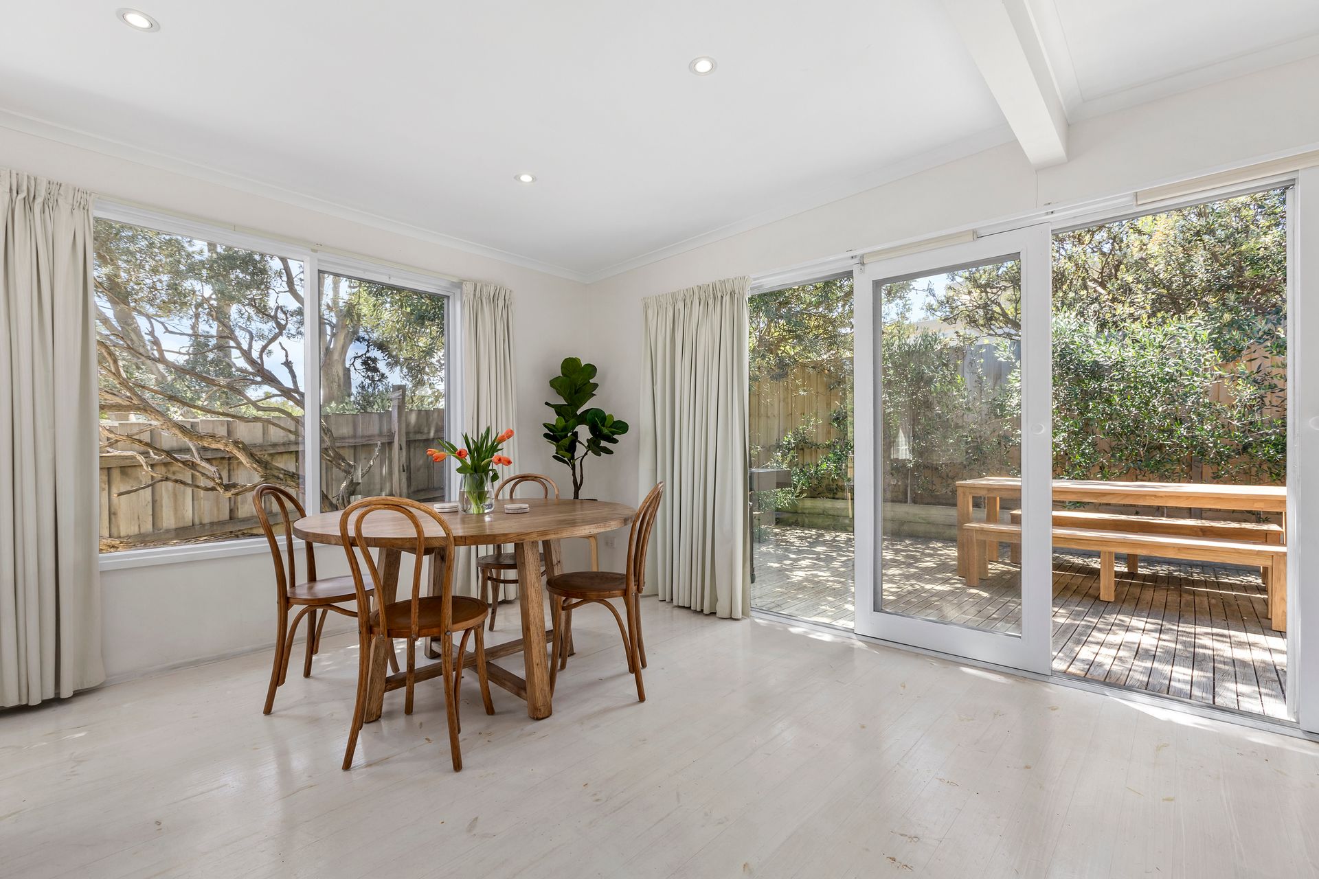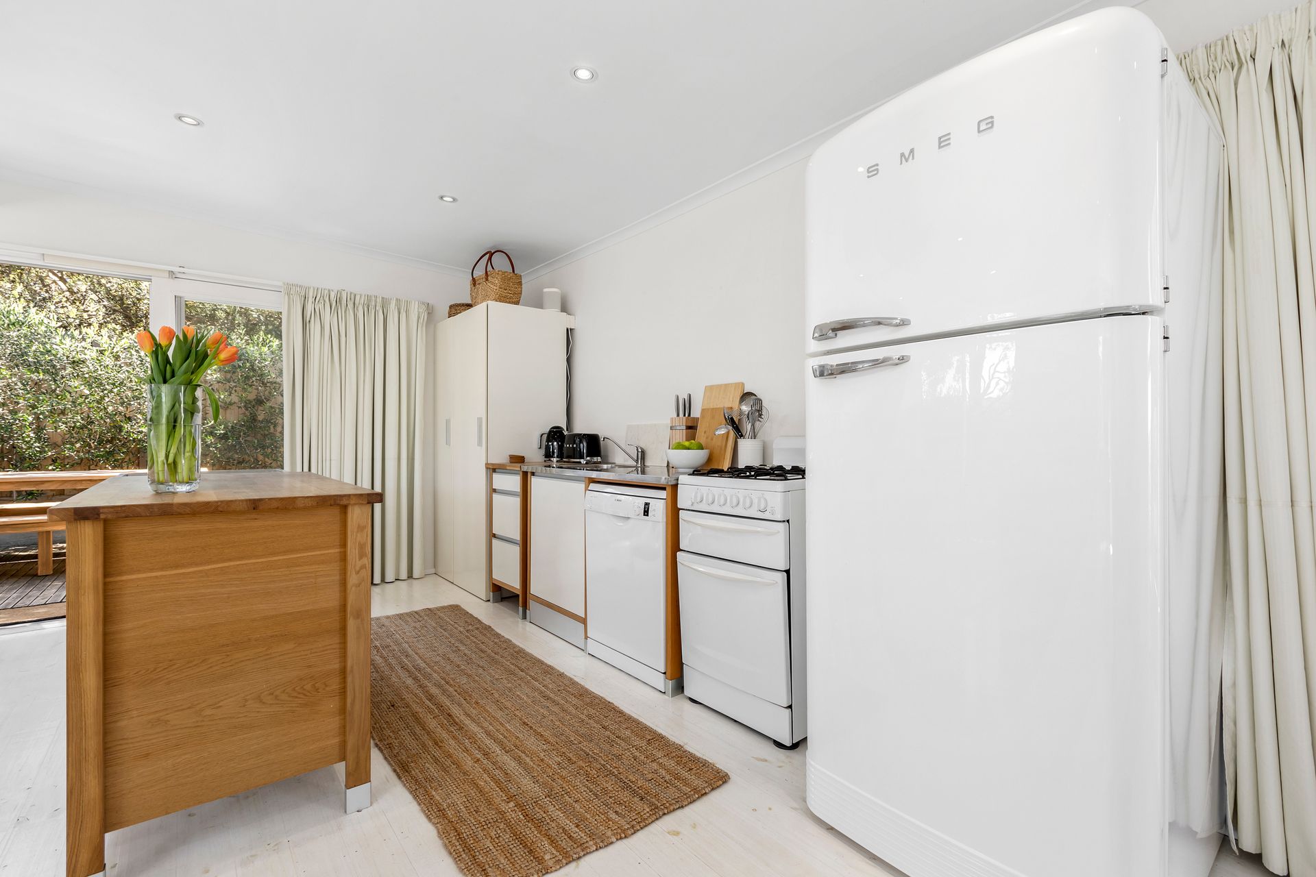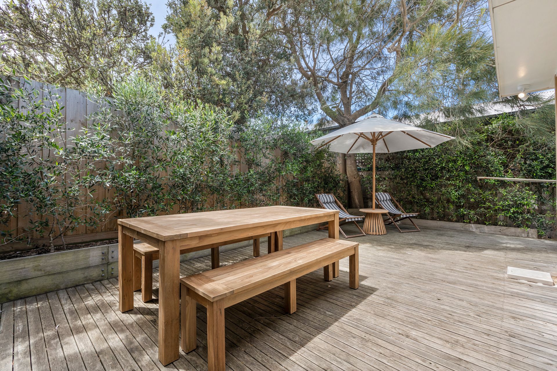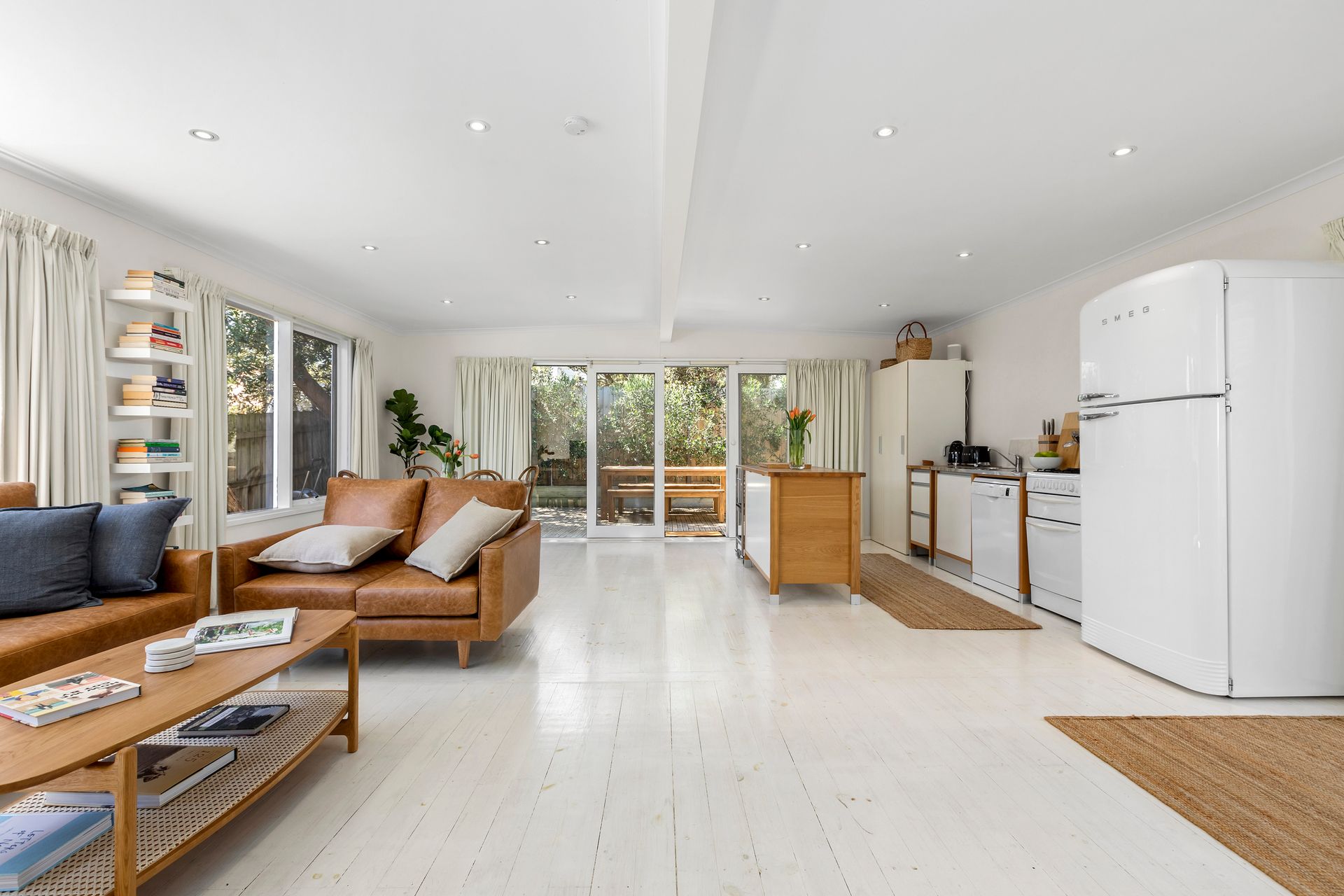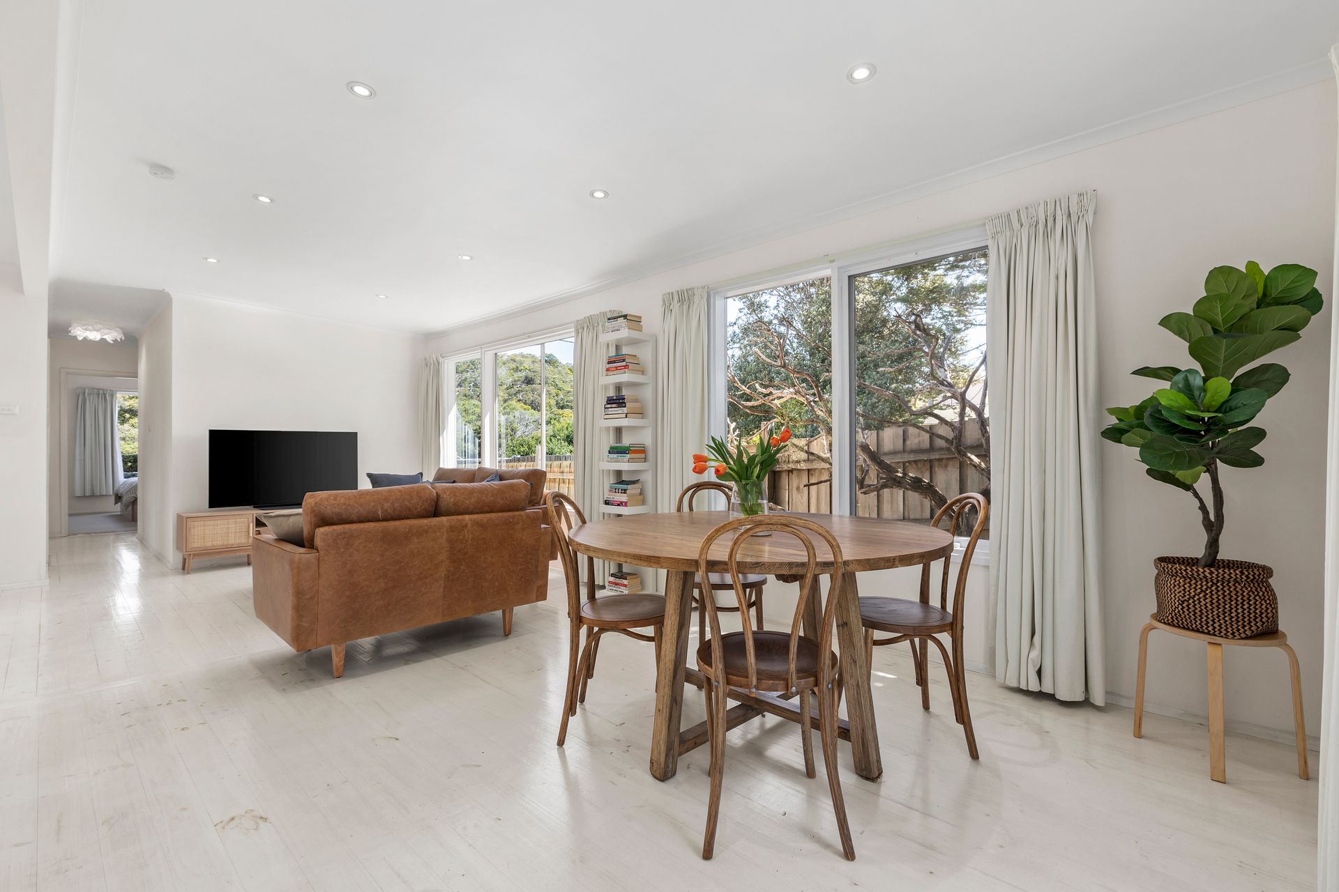 The airy north facing open plan living area opens out to a privately enclosed deck, offering the perfect spot to enjoy alfresco dining on a summer evening, backdropped by the soothing sounds of ocean waves.