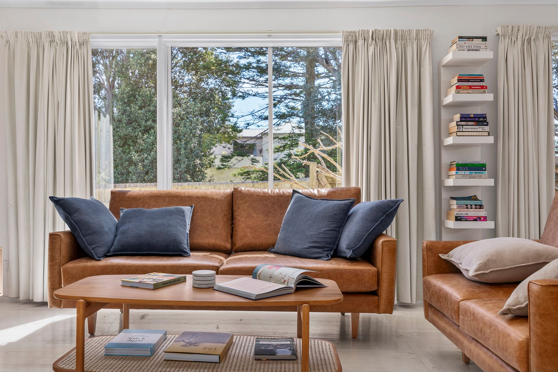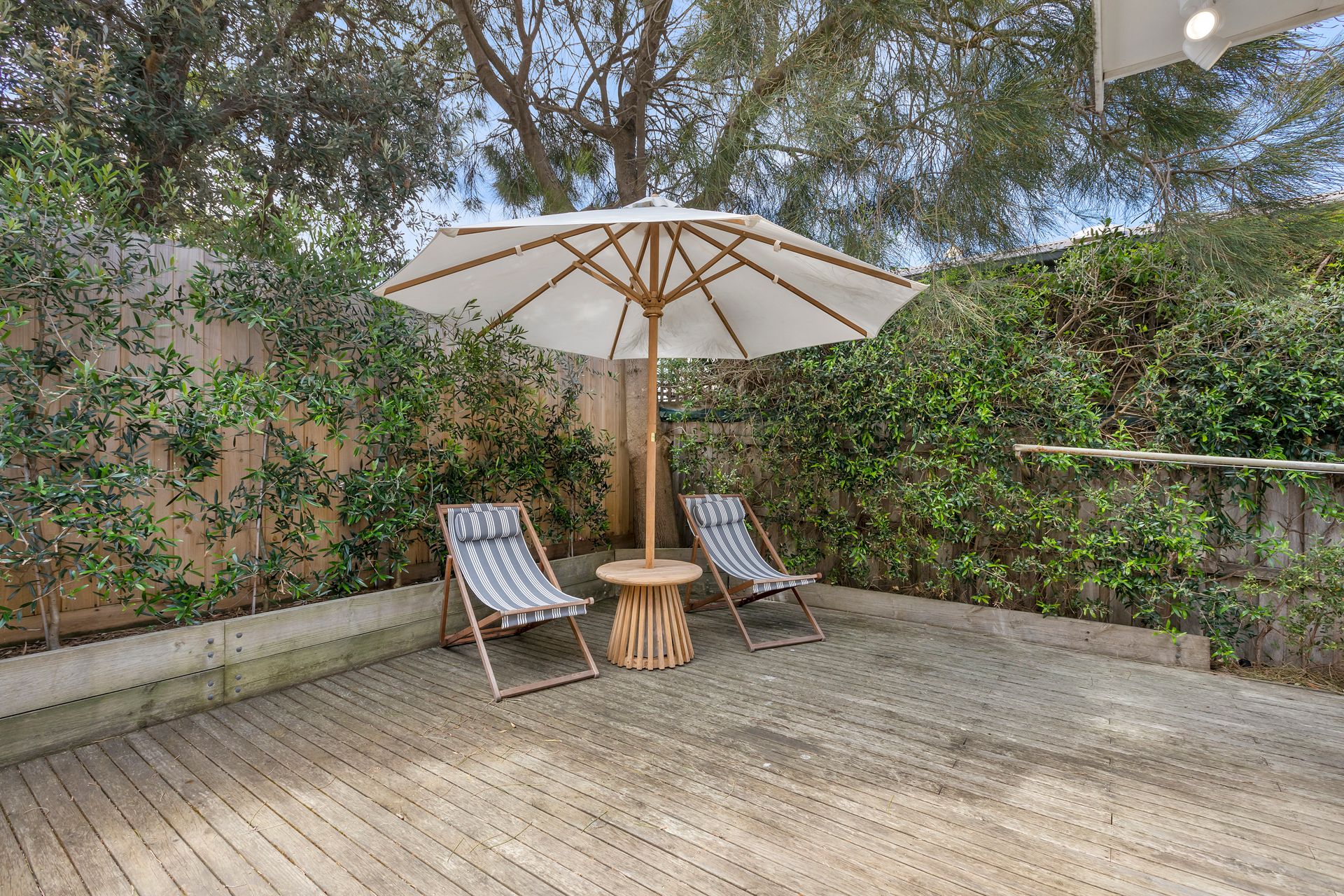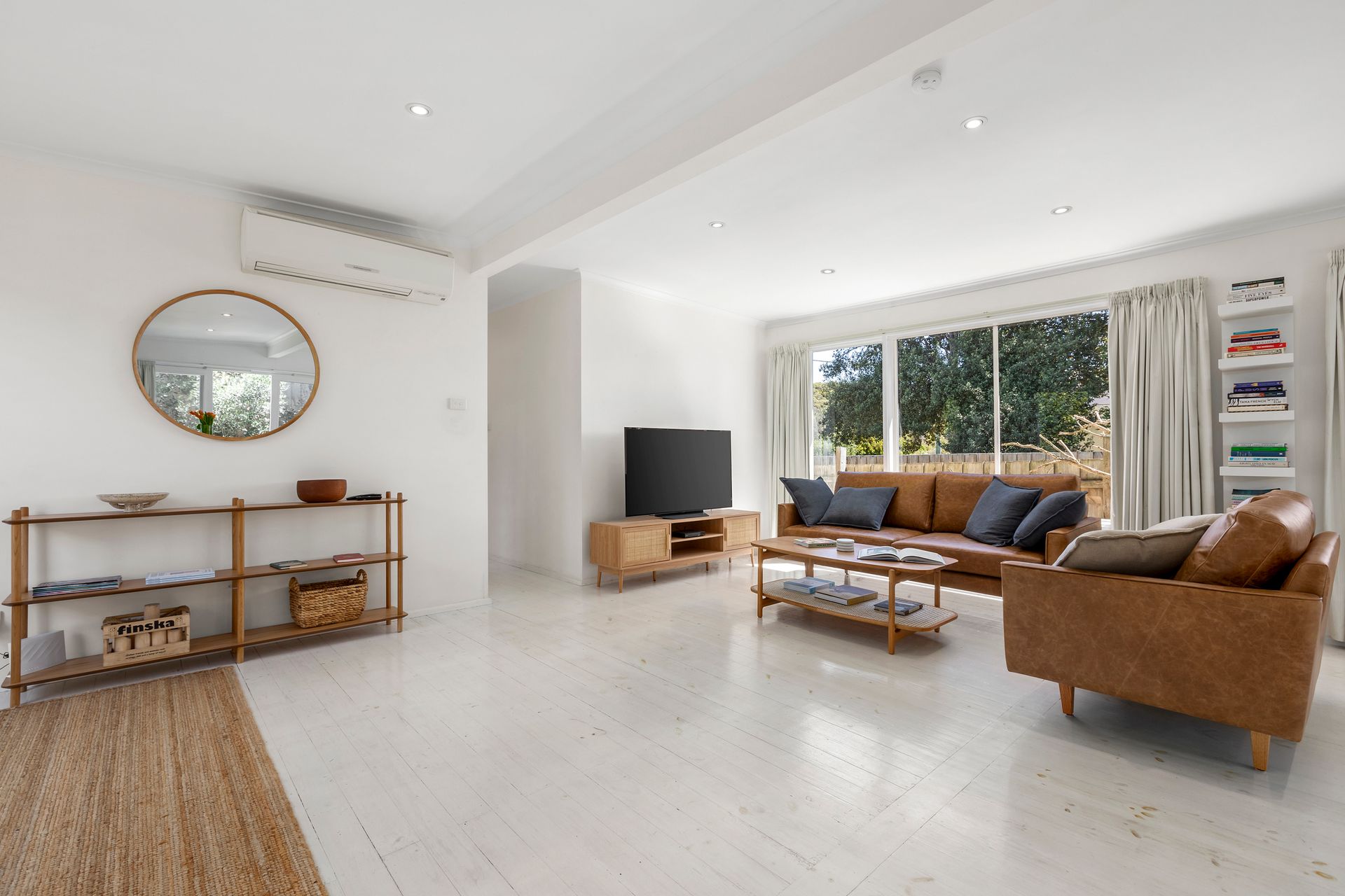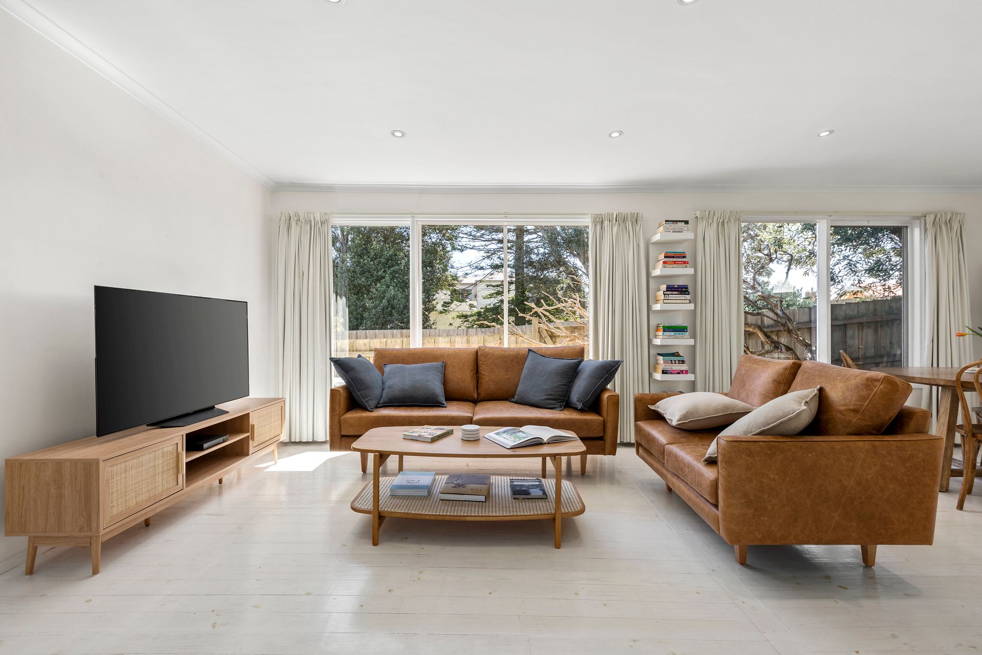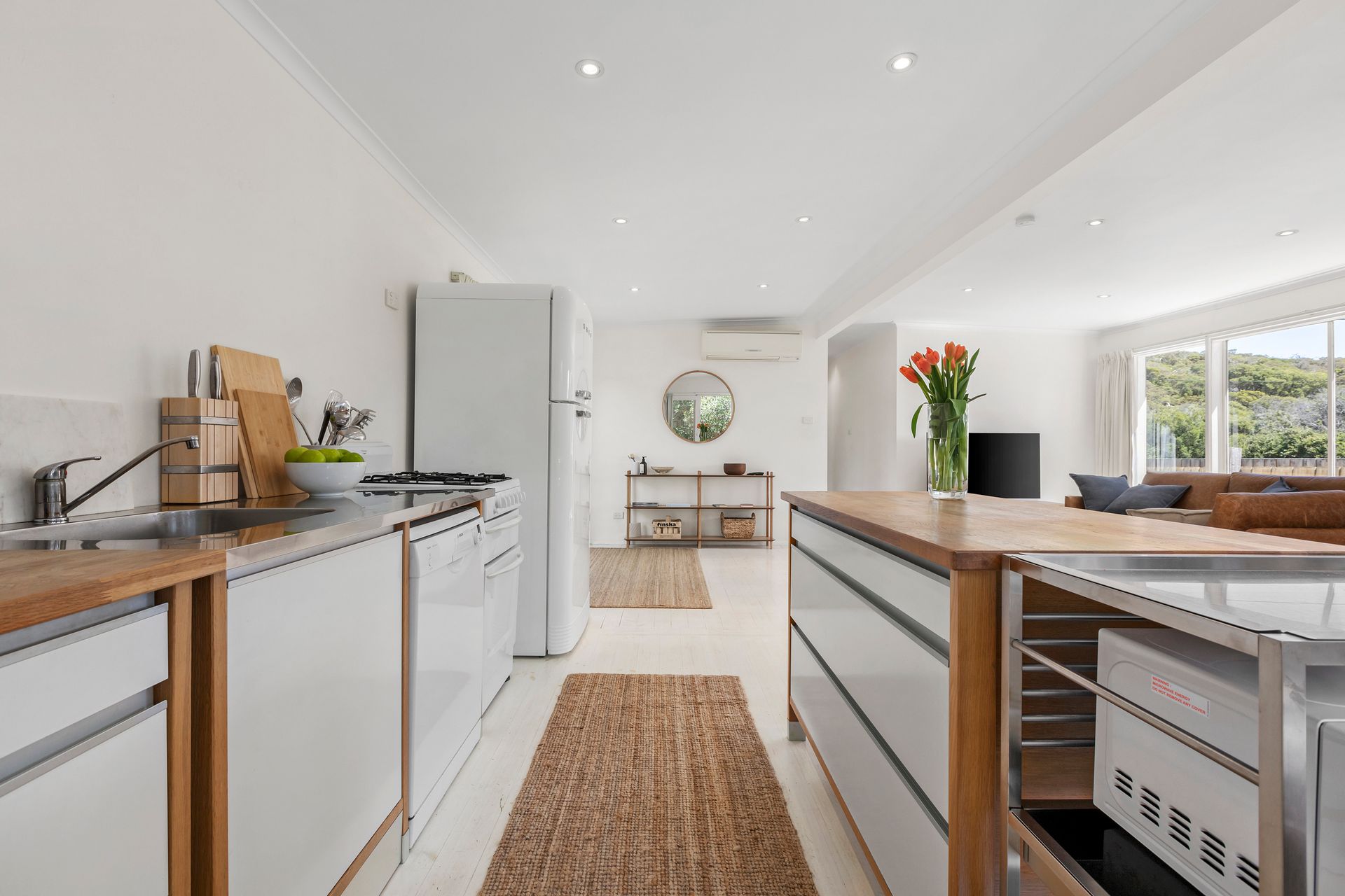 The airy north facing open plan living area opens out to a privately enclosed deck, offering the perfect spot to enjoy alfresco dining on a summer evening, backdropped by the soothing sounds of ocean waves.