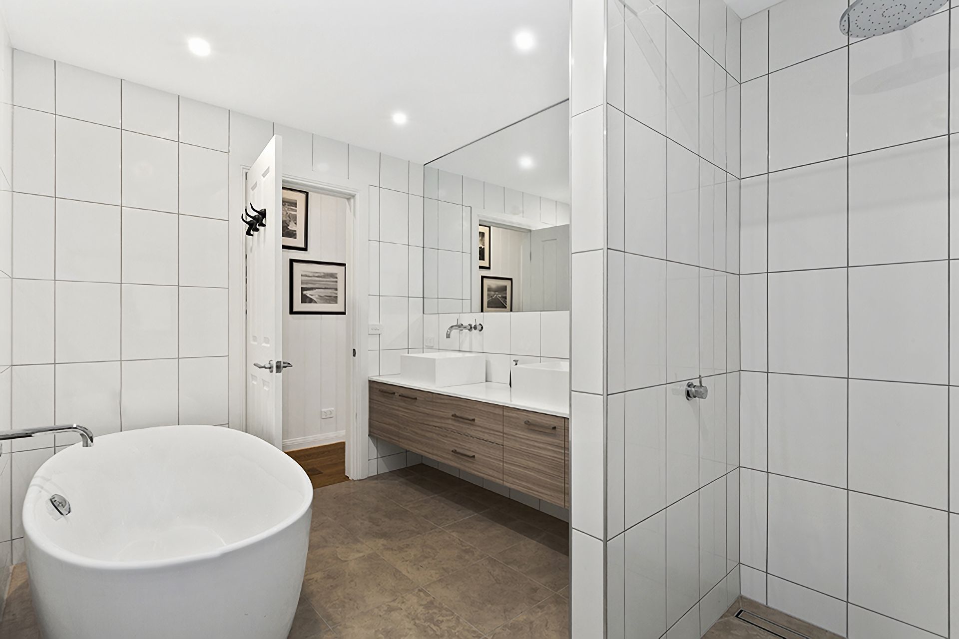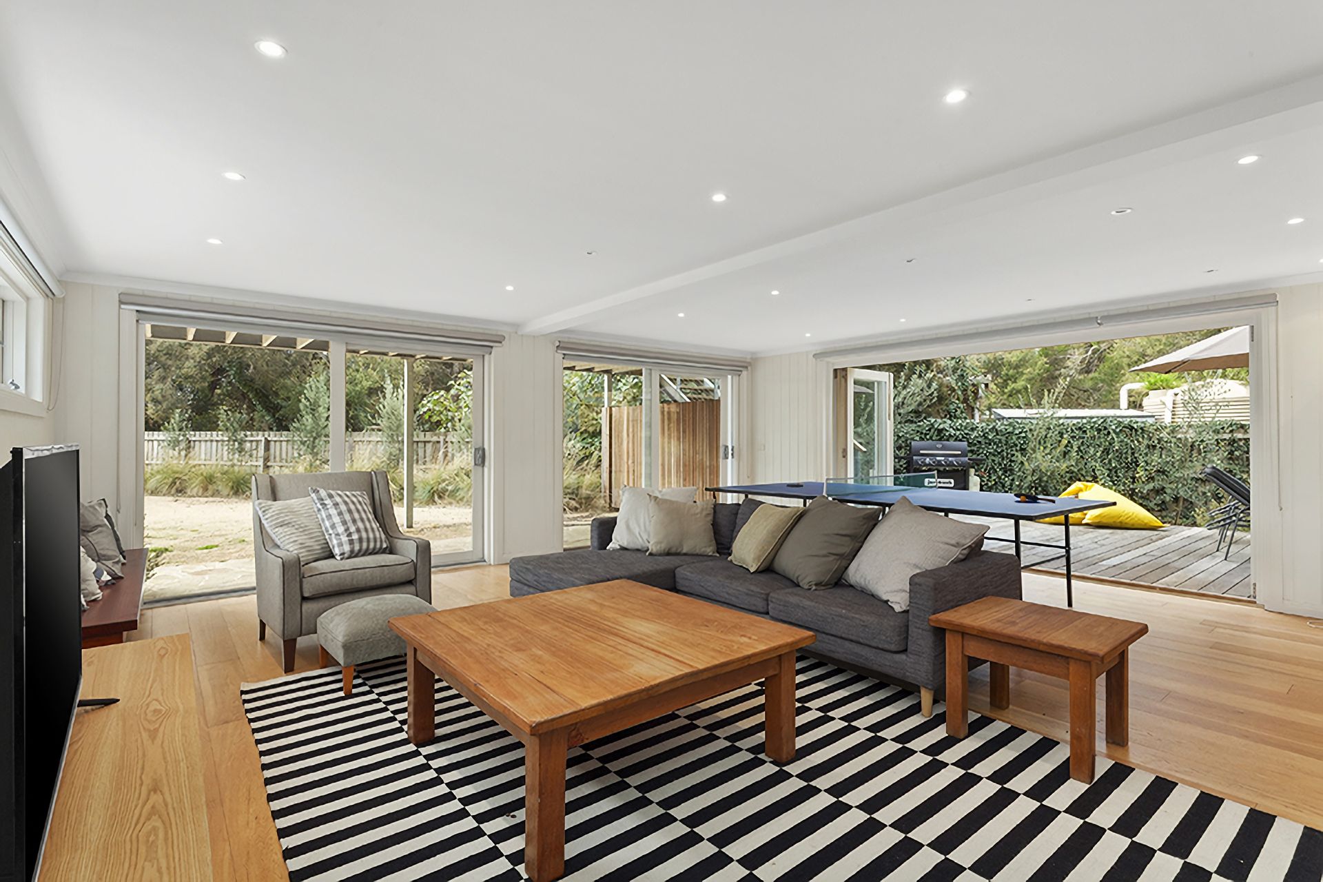 There is a modern bathroom upstairs offering bath plus a separate powder room, along with 2 bedrooms. Downstairs consists of 3 additional bedrooms, another modern bathroom and laundry with washing machine plus dryer. Also, downstairs is the kids' haven, comprising a lounge room with flat screen TV, table tennis table and bi-fold doors that open to another decked entertaining area.