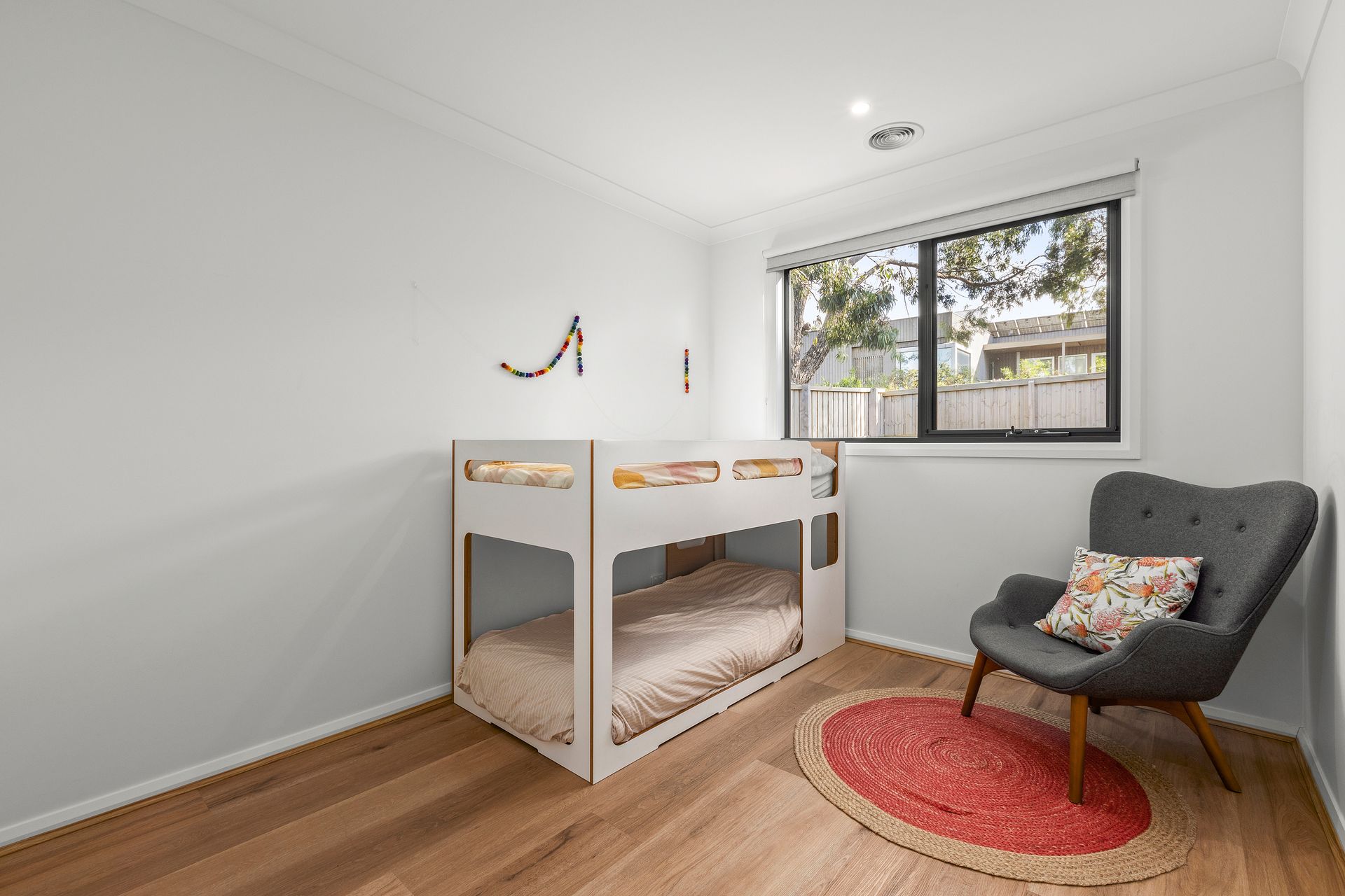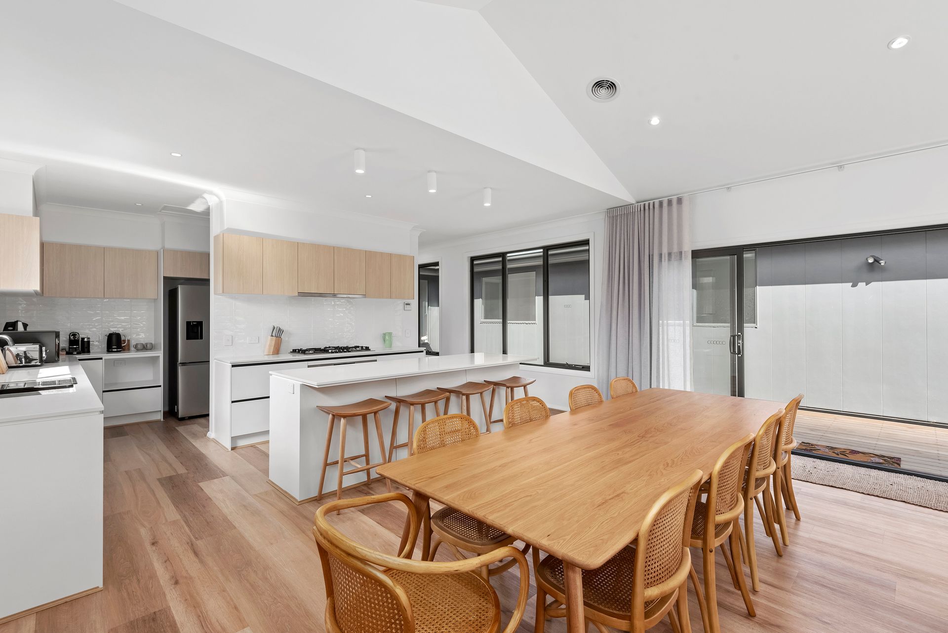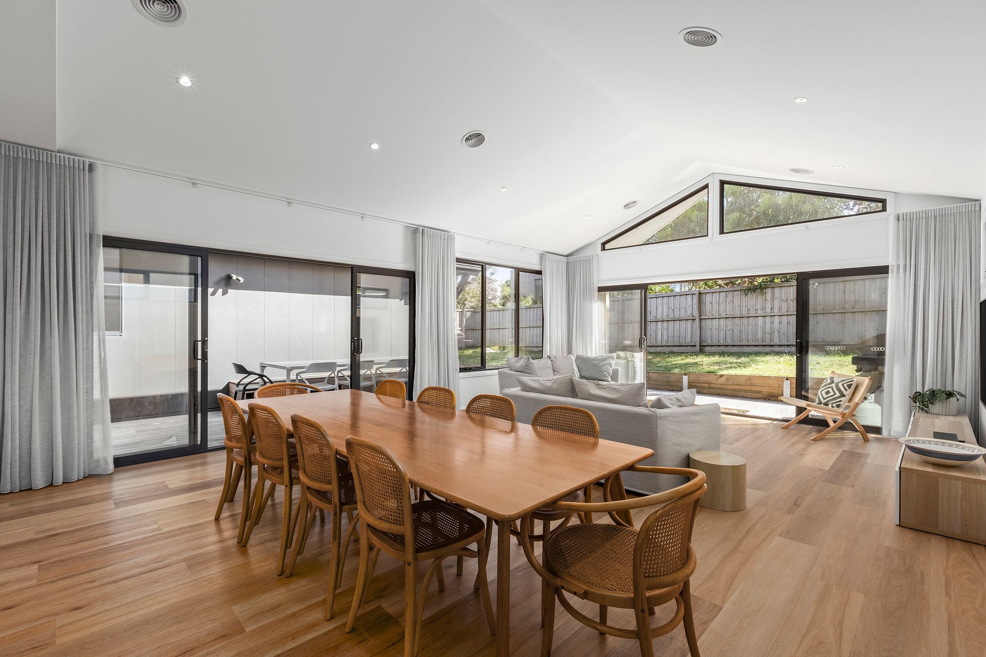 The unique design offers separate wings for bedrooms and entertaining providing ample space for a large family of for two families holidaying together. Offering 5 spacious bedrooms two with ensuite, a further queen room and two bunk rooms, one with King single bunks and a trundle bed and the other with cute kids bunks.