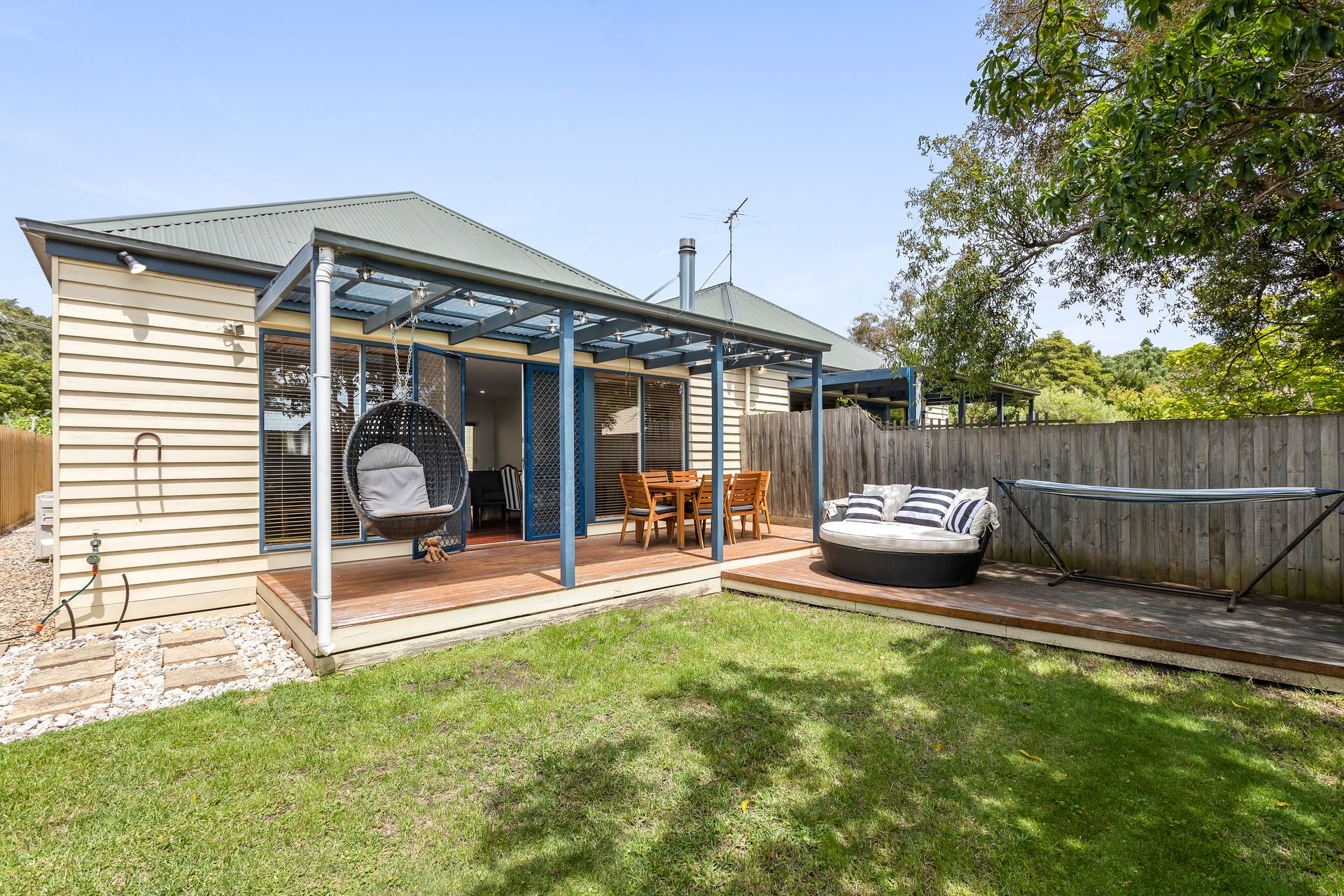 The secure backyard welcomes your pets, offering ample space for fun and games. With handy amenities like a clothes dryer, washing machine, hairdryer, iron & ironing board available, you can pack light and enjoy a carefree holiday. For your outdoor entertainment, enjoy the BBQ facilities, dine al fresco in the outdoor setting, or chill on the deck with family and friends.
