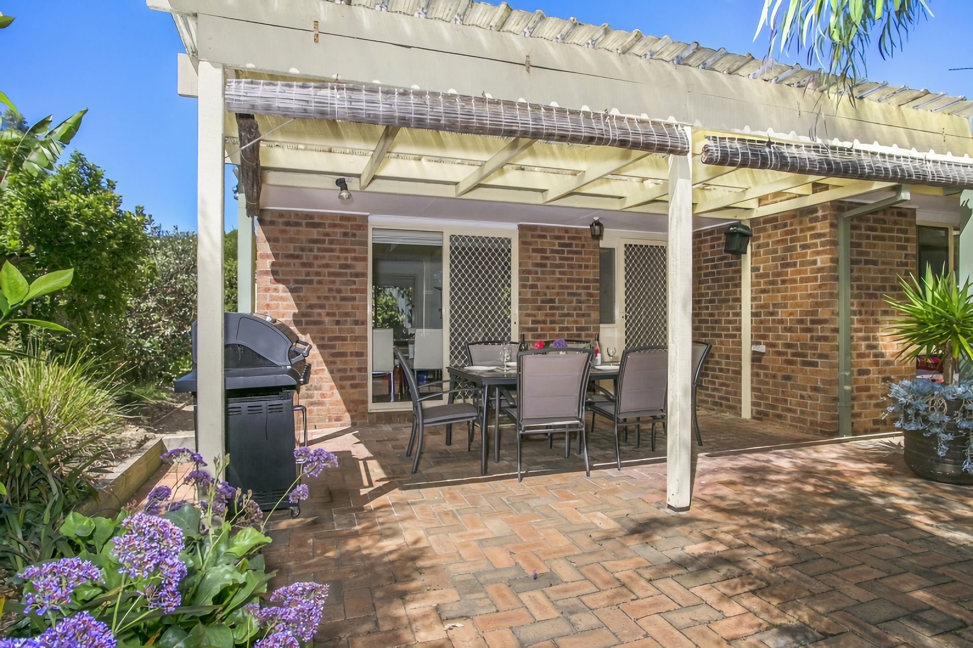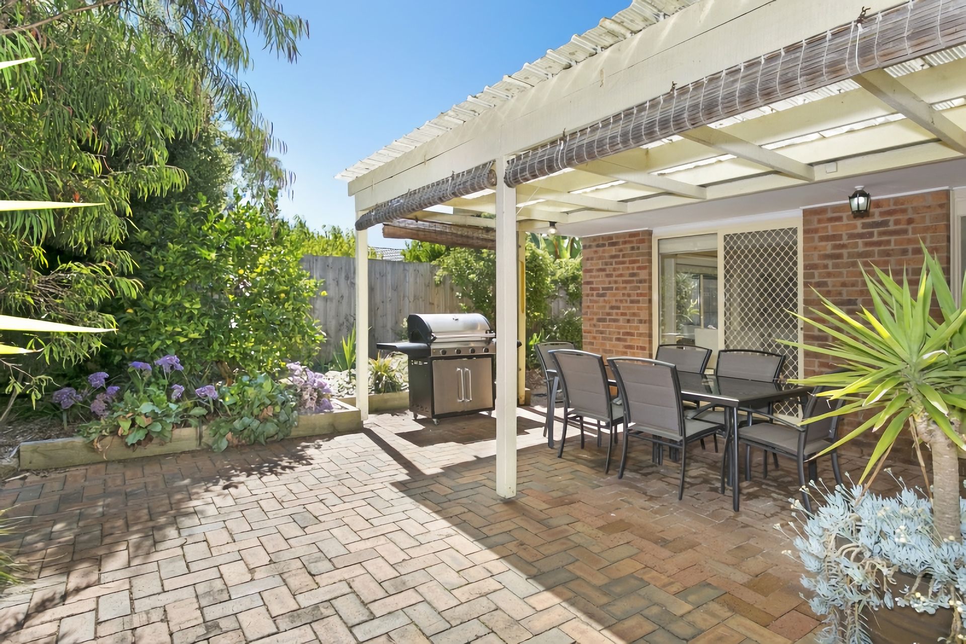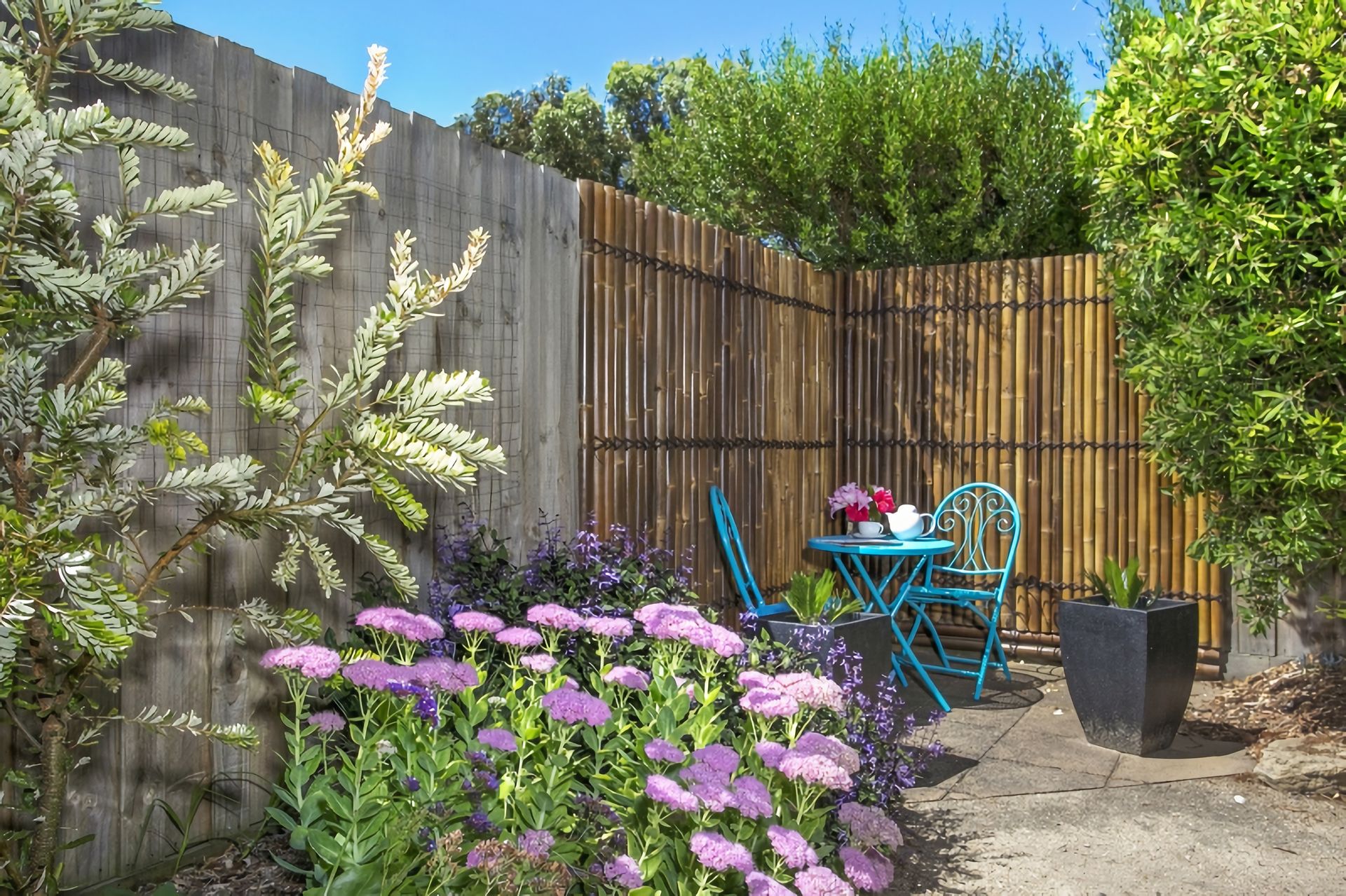 Outside, there is a covered area with an outdoor setting for 6 and BBQ, which is surrounded by a pretty courtyard garden.