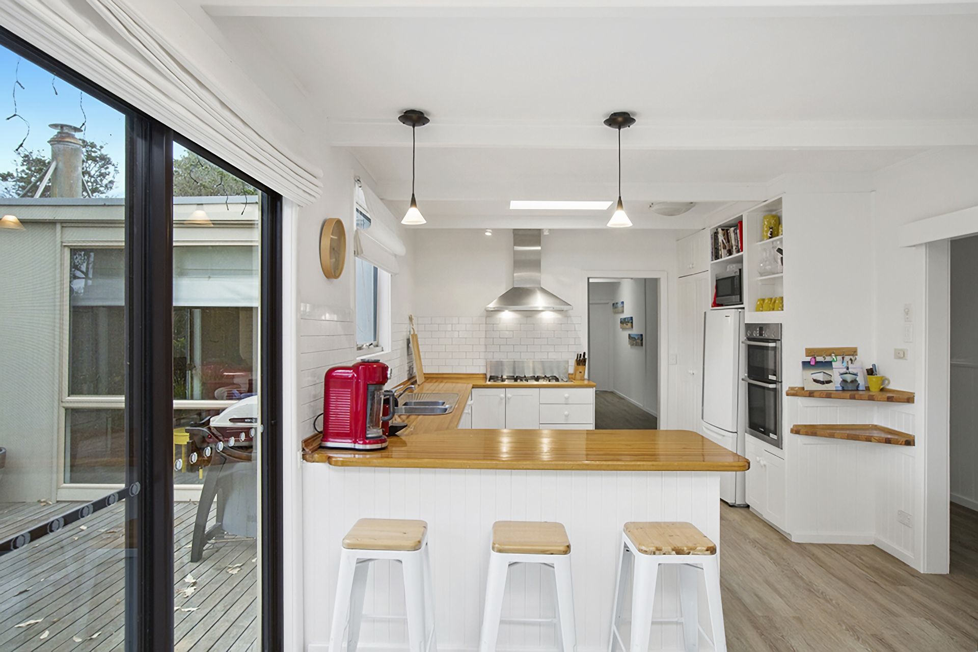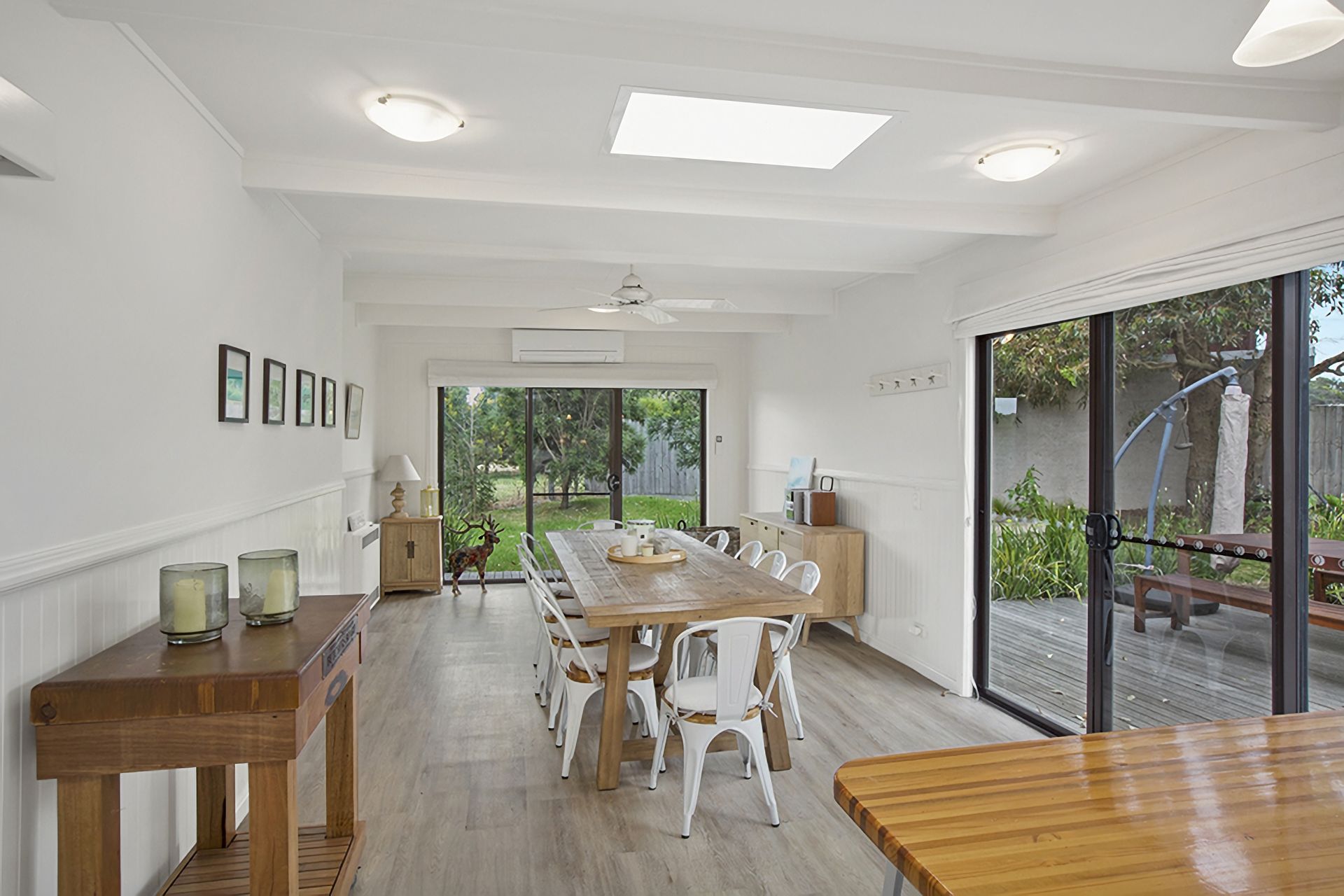 Fully equipped kitchen with Nespresso coffee machine, dishwasher and all modern appliances. Kitchen opens into expansive dining area with full views into garden and out onto deck.