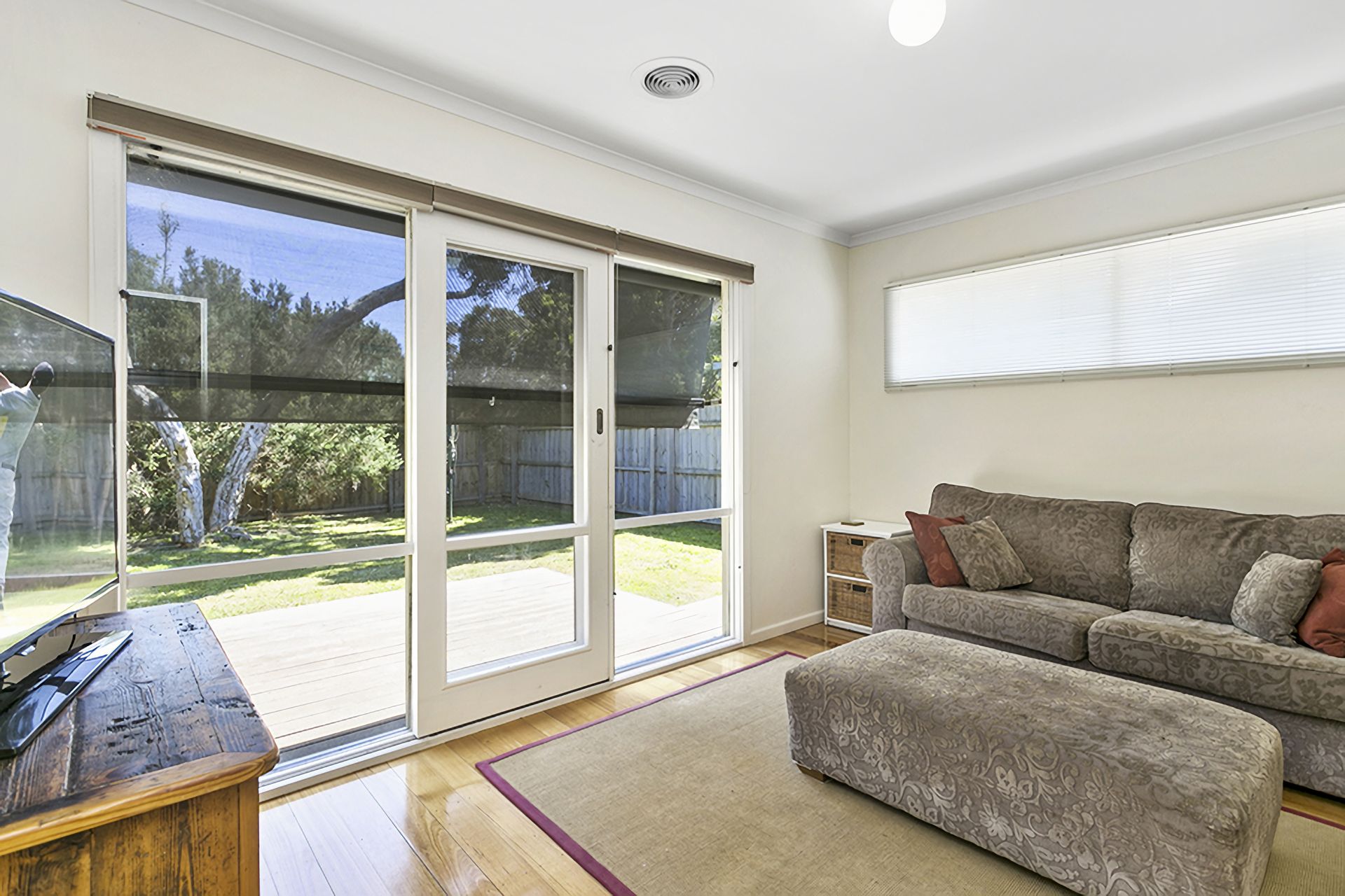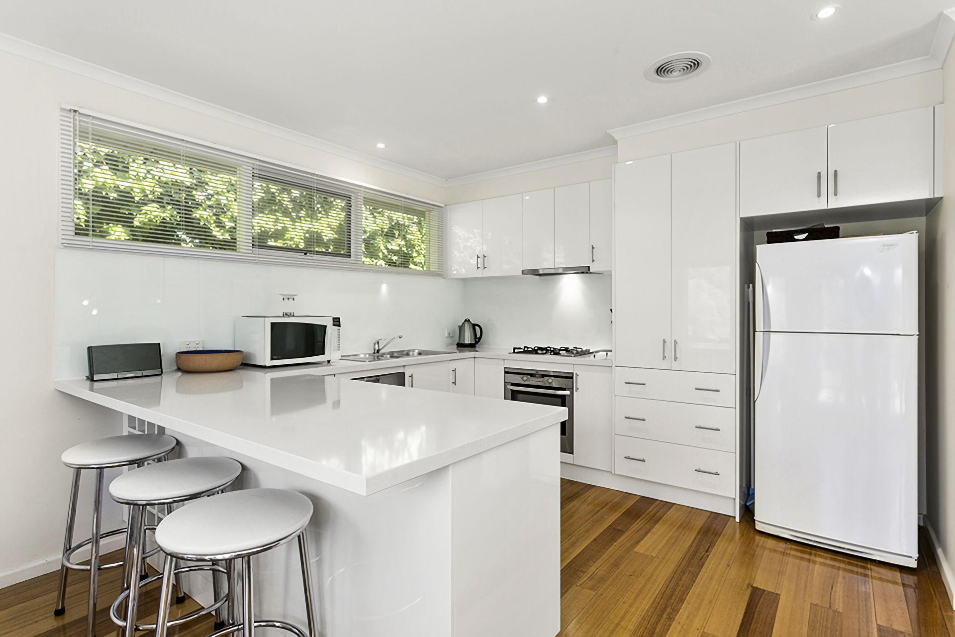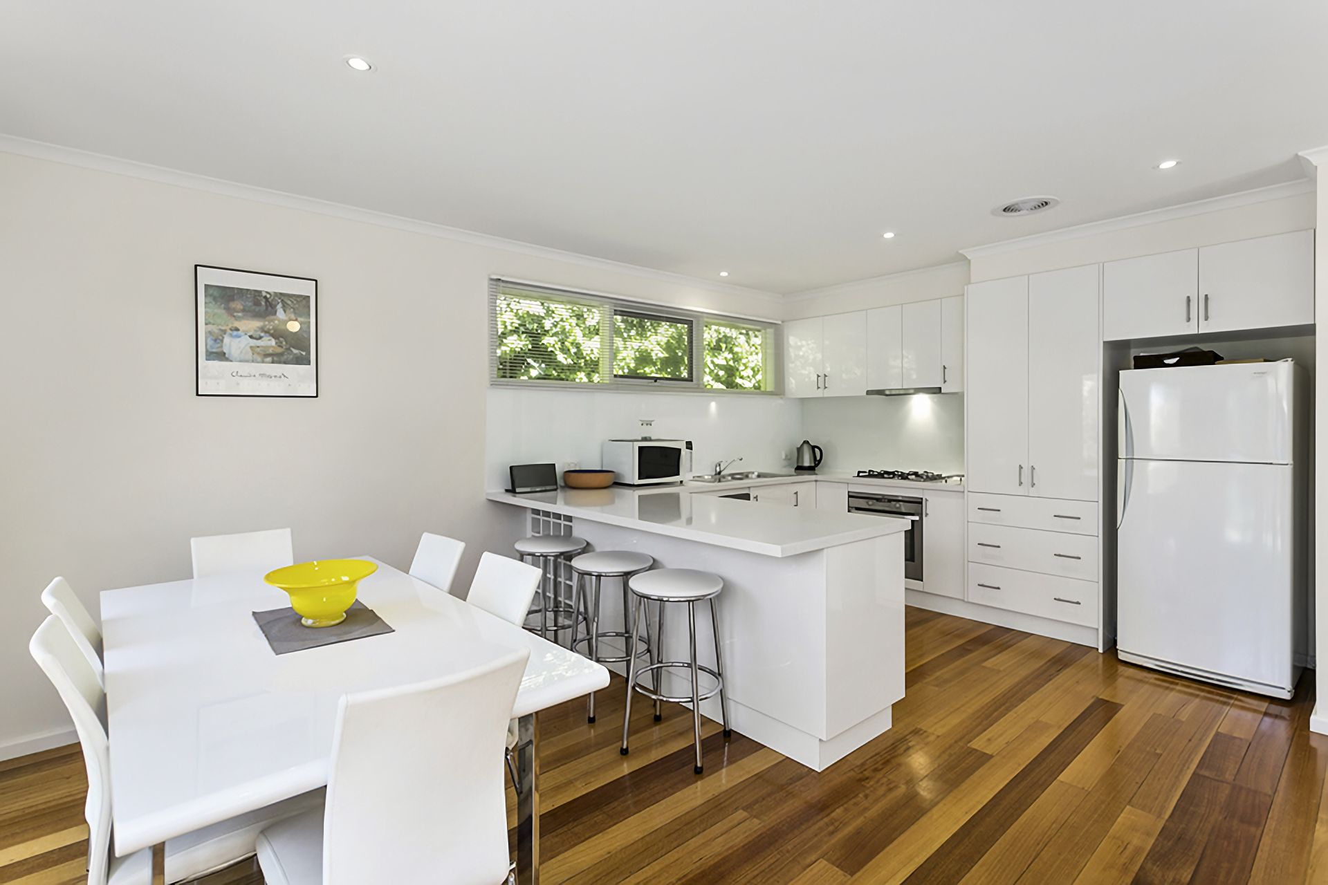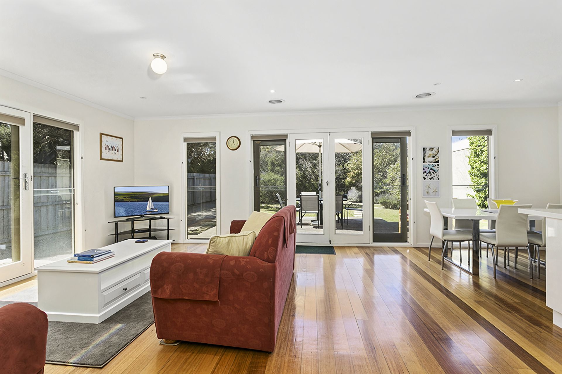 The well-appointed kitchen/dining/living space is sunny and bright with floor to ceiling windows which look out onto a large deck. A spacious front living room looks out onto the deck where you can sit and have breakfast under the umbrella on the outdoor setting.A second living room at the rear of the house with TV provides a space for children to escape from the adults! This room looks out onto another deck and fully fenced back garden.