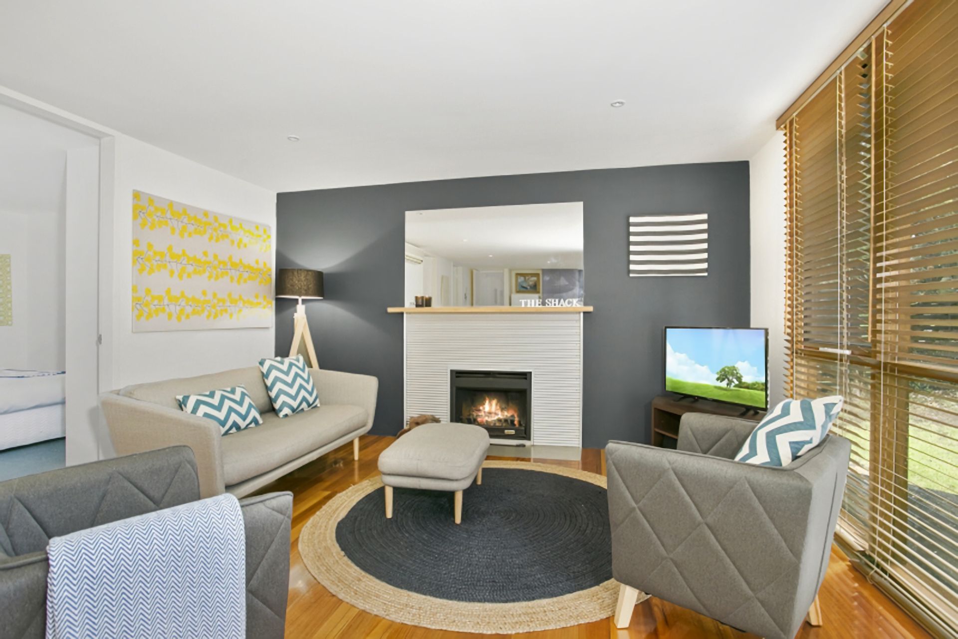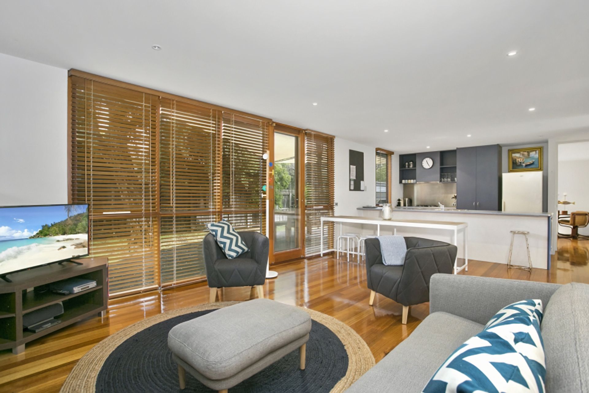 Open fireplace and modern, clean furniture and finishes give the room a simple, inviting feel. The kitchen is well equipped with everything you need including microwave, dishwasher, gas cooking and coffee machine. A separate sitting/lounge room with additional TV offers a comfortable parent's retreat.